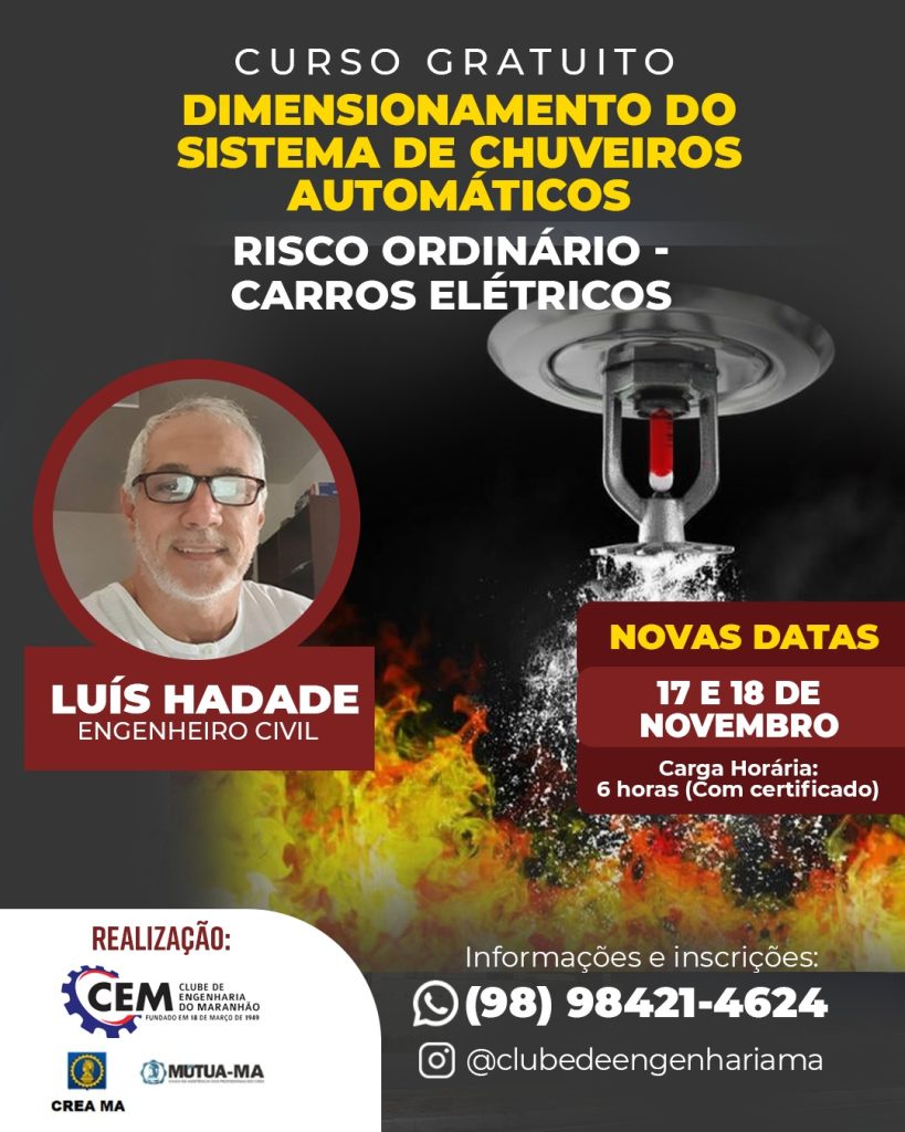 O Clube de Engenharia do Maranhão promove o curso presencial de Dimensionamento de Sistema de Chuveiros Automáticos (Sprinklers), voltado para profissionais e estudantes da área de engenharia e segurança contra incêndio.